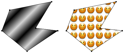 It will be helpful to look at some examples. The following illustration shows a polygon filled with two different paints. The polygon on the left uses a LinearGradient while the one on the right uses an ImagePattern. Note that in this picture, the paint is used only for filling the polygon. The outline of the polygon is drawn in a plain black color. However, Paint objects can be used for stroking shapes as well as for filling them. These pictures were made by the sample program PaintDemo.java. In that program, you can select among several different paints, and you can control certain properties of the paints.